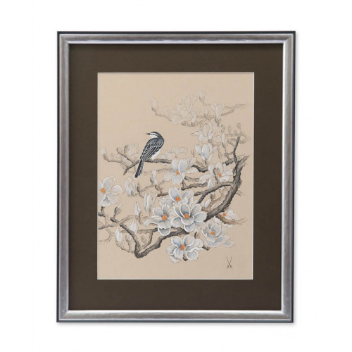 Кожаный картина, птица на магнолии ветка, серый, графический Ausf–внедрение, кожа на коже, 54 х 44 см