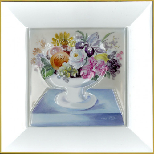 Небольшой барельеф панно с золотой каймой. Красочные цветы и Fr–хочу в Вэй en фарфоровую чашку стоя на голубом столе. Ausf–соприкосновения с нижней и aufglasur цветов