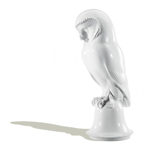 Max Esser zählte neben seinem Lehrer August Gaul zu den bedeutendsten Tierplastikern des frühen 20. Jahrhunderts. Dem damaligen Manufakturdirektor Max Adolf Pfeiffer war es gelungen, ihn dauerhaft für das Unternehmen zu engagieren. Essers Eule aus dem Jahr 1921 ist ein besonders schönes Beispiel für den unverwechselbaren Stil des Künstlers, den man wohl am besten als eine Gratwanderung zwischen naturgetreuer Darstellung und dekorativer Formensprache beschreiben kann. Durch die nur angedeuteten Gefiederstrukturen wird das Tier gleichsam in eine zeitlos-dekorative Sphäre versetzt. Und der feine Gefiederkranz des Gesichts korrespondiert harmonisch mit der Verzierung des unteren Sockelrandes. Zugleich sprechen uns sämtliche Merkmale der Eule unmittelbar an, so, als ob wir ein lebendiges Exemplar der Gattung vor uns hätten. Diesen faszinierenden Effekt können Sie auch bei weiteren Modellen auf sich wirken lassen, die Max Esser in seinem Manufakturatelier in den 1920er Jahren geschaffen hat, und selbstverständlich lohnt ein Vergleich der Eule in Weiß mit ihrem Pendant in Böttgersteinzeug (86513).