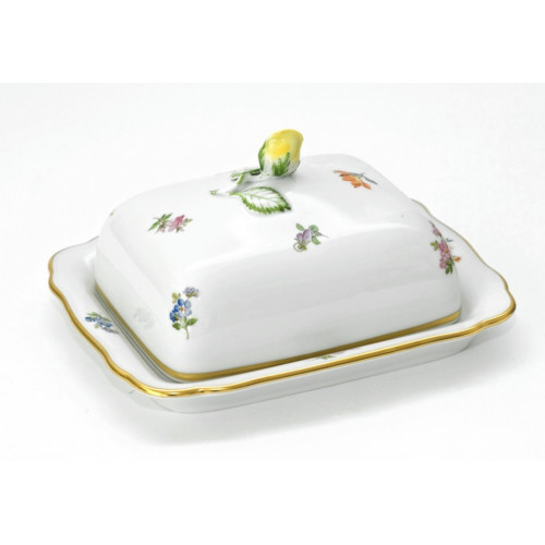 Butterdose 2-teilig, Form "Neuer Ausschnitt", Gestreute Blümchen, bunt, Goldrand, L 16,5 cm