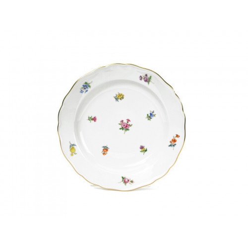 Teller, Form "Neuer Ausschnitt", Gestreute Blümchen, bunt, Goldrand, ø 18 cm