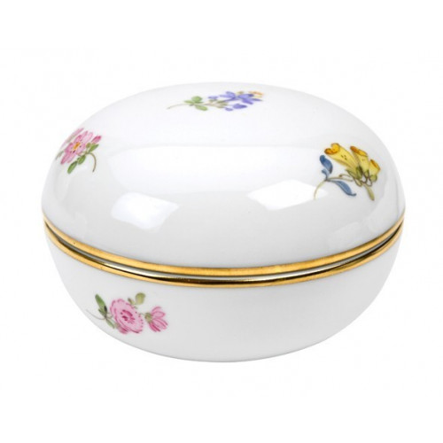 Dose, Form "Neuer Ausschnitt", Gestreute Blümchen, bunt, Goldrand, ø 7,5 cm