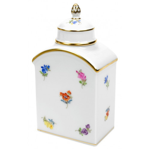 Teedose, Form "Neuer Ausschnitt", Gestreute Blümchen, bunt, Goldrand, H 14 cm
