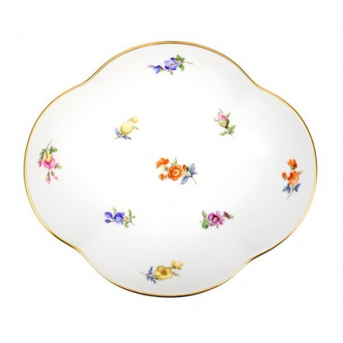 Schälchen, Form "Neuer Ausschnitt", Gestreute Blümchen, bunt, Goldrand, L 14 cm