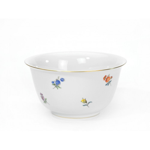 Müslischale, Form "Neuer Ausschnitt", Gestreute Blümchen, bunt, Goldrand, L 16 cm
