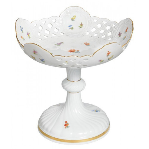 Schale auf Fuß durchbrochen, Form "Neuer Ausschnitt", Gestreute Blümchen, bunt, Goldrand, 22 cm