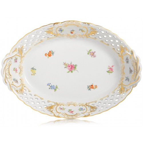 Korb, durchbr. mit 2 Henkel, Gestreute Blümchen, bunt, Schilderornamente goldstaffiert, Goldrand, L 25 cm
