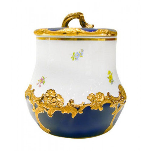 Dose, Gestreute Blümchen, bunt, königsblau glasiert, Goldbronze, leicht, H 18 cm