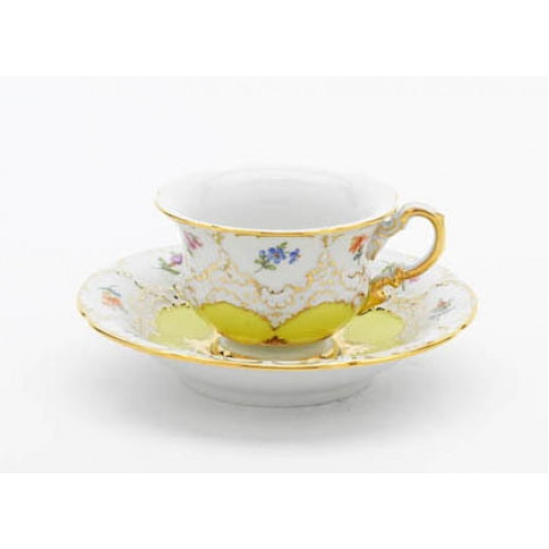 Espressotasse, Gestreute Blümchen, bunt, gelb glasiert, Gold angespitzt, V 0,07 l