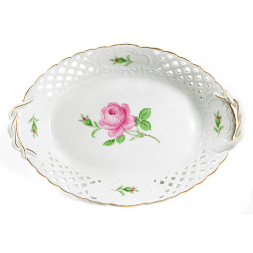 Korb, durchbr. mit 2 Henkel, Rose mitte, bunt, Goldrand, L 25 cm