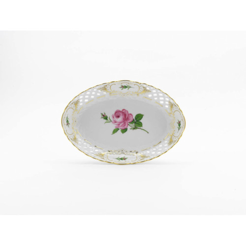 Schale, durchbr. oval, Rose mitte, bunt, Schilderornamente goldstaffiert, Goldrand, L 25 cm