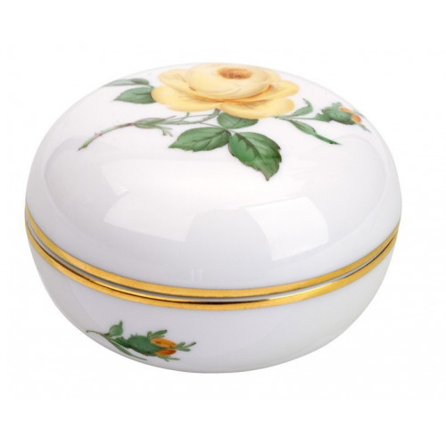 Dose, Form "Neuer Ausschnitt", Rose mitte, gelb, Goldrand, ø 7,5 cm