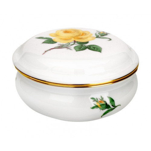 Dose, Form "Neuer Ausschnitt", Rose mitte, gelb, Goldrand, ø 9 cm