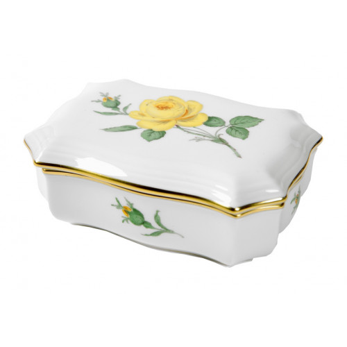 Dose, Form "Neuer Ausschnitt", Rose mitte, gelb, Goldrand, L 10 cm