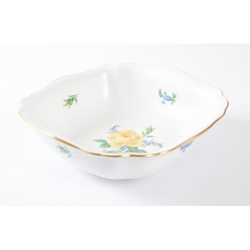 Schüssel, eckig, Rose und Vergißmeinnicht, mitte, gelb, Goldrand, L 18,5 cm