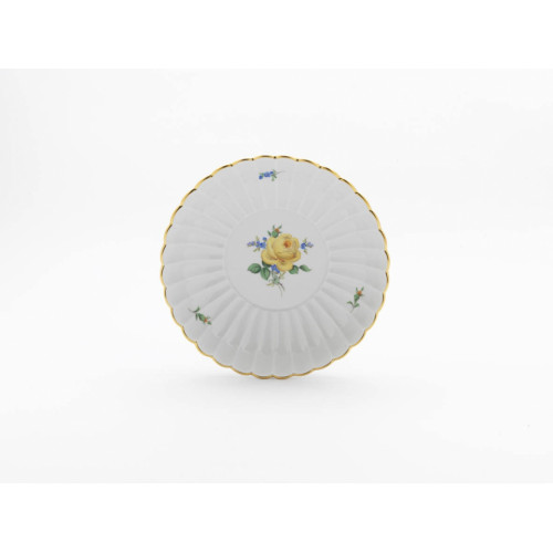 Beilageschale rund,gemuschelt, Rose und Vergißmeinnicht, mitte, gelb, Goldrand, ø 20 cm