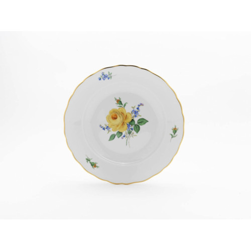 Teller, Form "Neuer Ausschnitt", Rose und Vergißmeinnicht, mitte, gelb, Goldrand, ø 26 cm
