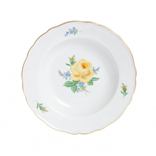 Suppenteller, Form "Neuer Ausschnitt", Rose und Vergißmeinnicht, mitte, gelb, Goldrand, ø 22 cm
