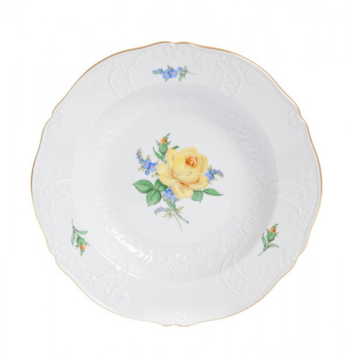 Suppenteller, Rose und Vergißmeinnicht, mitte, gelb, Goldrand, 22,5 cm