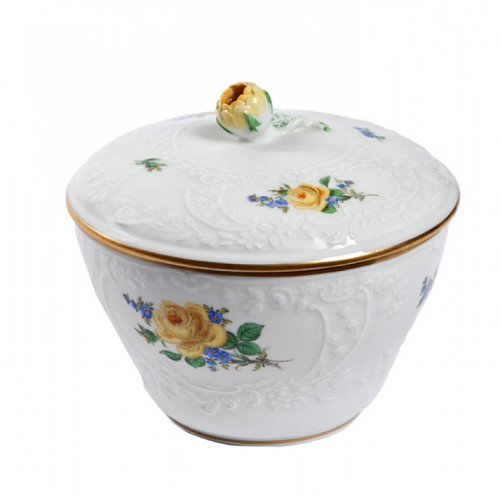 Zuckerdose, Rose und Vergißmeinnicht, mitte, gelb, Goldrand, 10 cm