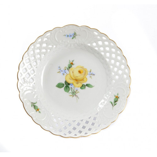 Teller, durchbr., Rose und Vergißmeinnicht, mitte, gelb, Goldrand, ø 15 cm