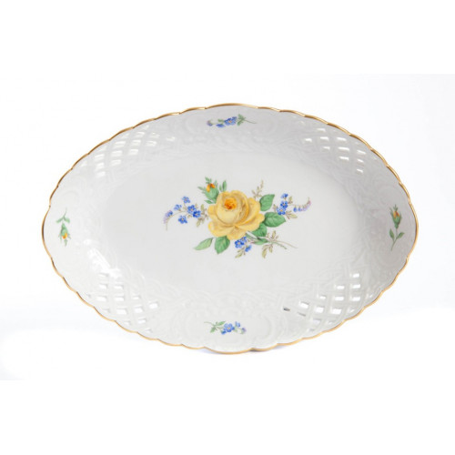 Schale, durchbr. oval, Rose und Vergißmeinnicht, mitte, gelb, Goldrand, L 25 cm