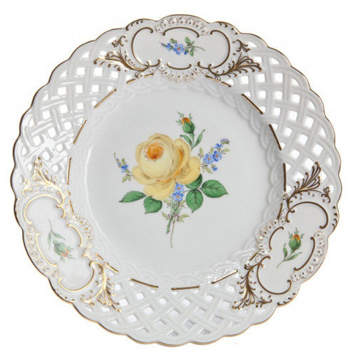 Teller, durchbr., Rose u.Vergißmeinn.,mitte,gelb,Schilderornamente goldstaff.,Goldrand, ø 21 cm