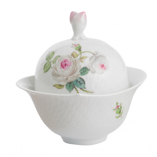 Zuckerdose, Form "Wellenspiel Relief", Rosenmalerei, Weiße Rose, vielblättrig, purpur Kern, bunt, weißer Rand, V 0,20 l