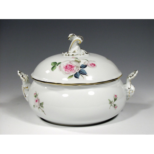 Terrine, rund mit Schnörkel, Weiße Rose mit Purpurkern, Goldrand, V 1,75 l