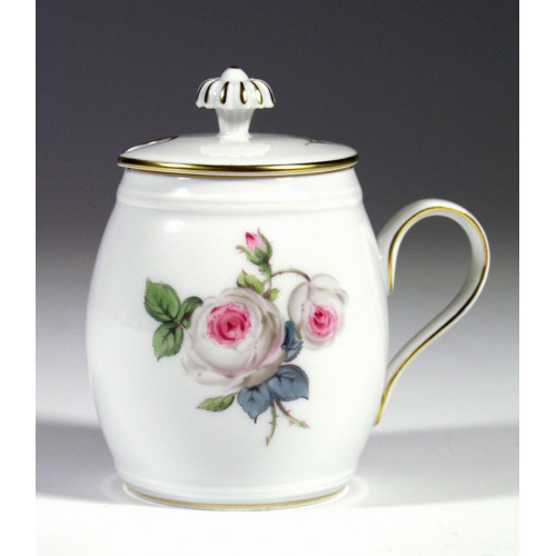 Senfgefäß, Form "Neuer Ausschnitt", Weiße Rose mit Purpurkern, Goldrand, V 0,15 l
