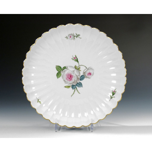 Beilageschale rund,gemuschelt, Weiße Rose mit Purpurkern, Goldrand, ø 28 cm
