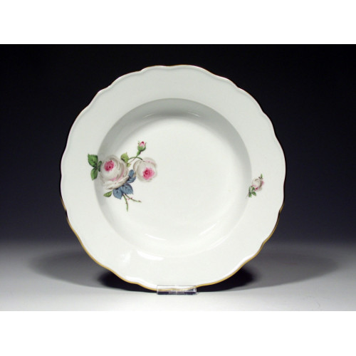 Suppenteller, Form "Neuer Ausschnitt", Weiße Rose mit Purpurkern, Goldrand, ø 24 cm