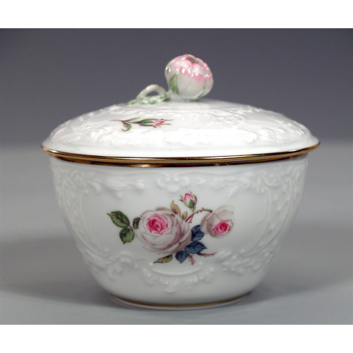 Zuckerdose, Weiße Rose mit Purpurkern, Goldrand, H 9 cm