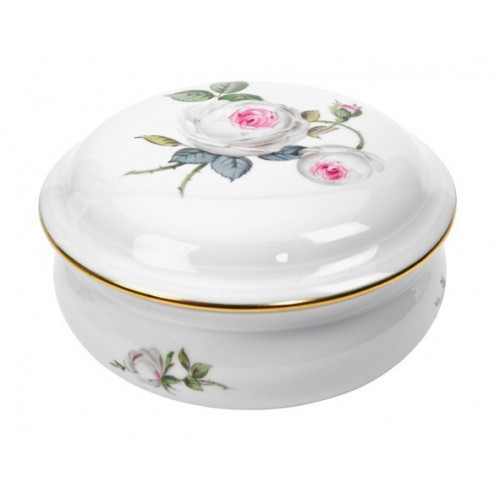 Dose, Form "Neuer Ausschnitt", Weiße Rose mit Purpurkern, Goldrand, ø 9 cm