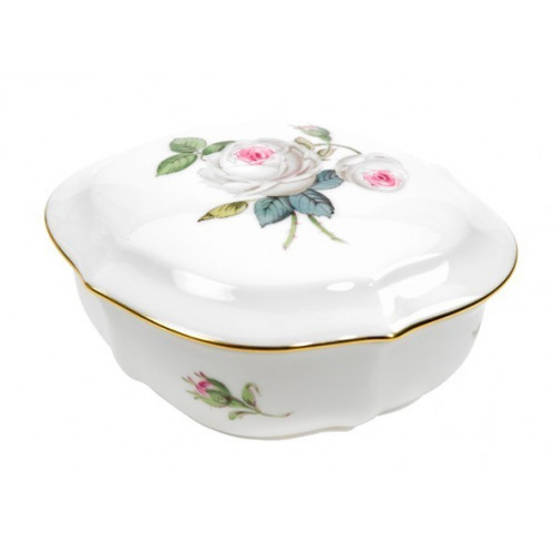 Dose, Form "Neuer Ausschnitt", Weiße Rose mit Purpurkern, Goldrand, L 9,5 cm