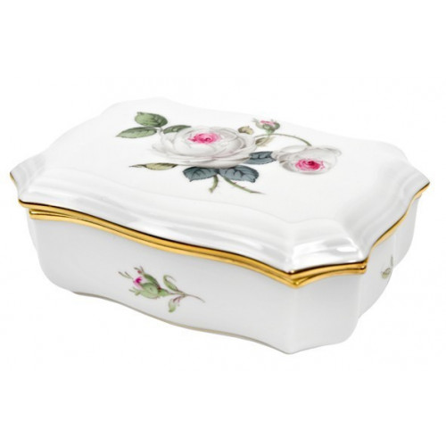 Dose, Form "Neuer Ausschnitt", Weiße Rose mit Purpurkern, Goldrand, L 10 cm