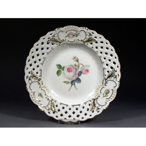 Teller, durchbr., Weiße Rose, vielblättrig, purpur Kern, Schilderornamente goldstaff., ø 19 cm