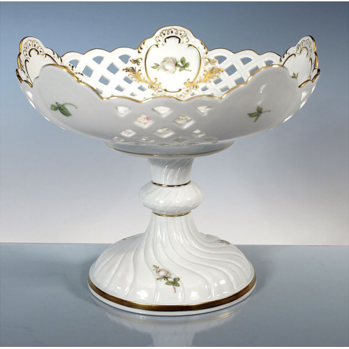 Schale auf Fuß durchbrochen, Weiße Rose, vielblättrig, purpur Kern, Schilderornamente goldstaff., H 17 cm