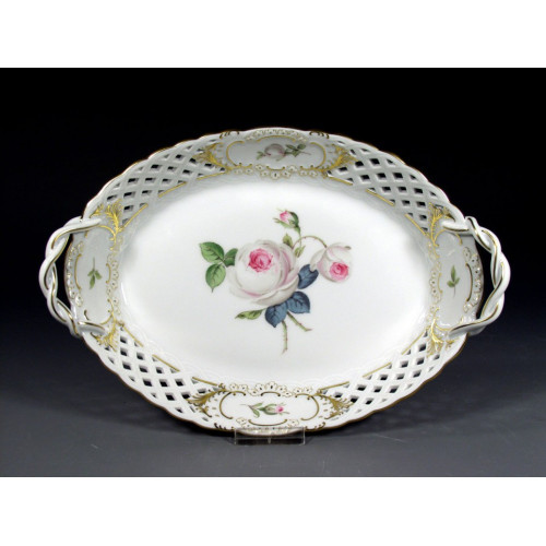 Korb, durchbr. mit 2 Henkel, Weiße Rose, vielblättrig, purpur Kern, Schilderornamente goldstaff., L 25 cm