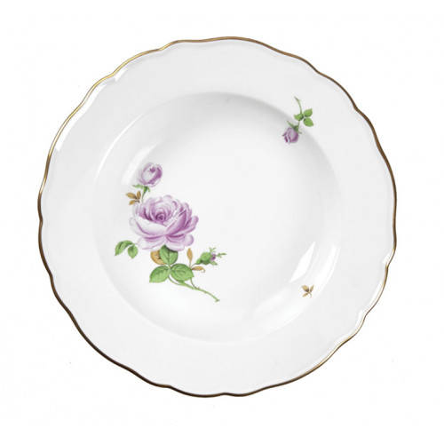 Suppenteller, Form "Neuer Ausschnitt", Rosenmalerei, violette Rose, vielblättrig, bunt, Goldrand, ø 22 cm