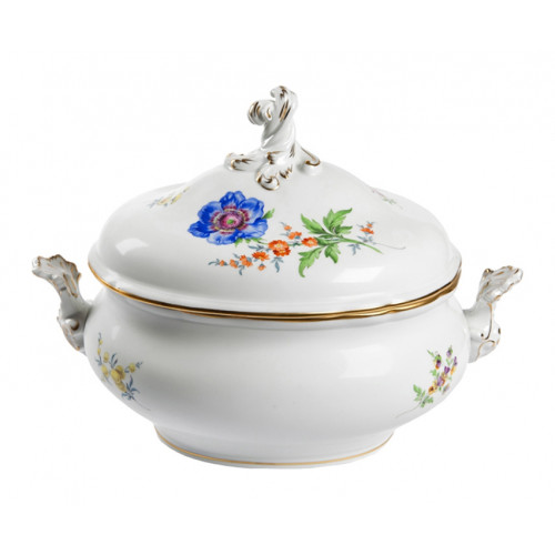 Terrine, oval mit Schnörkel, Form "Neuer Ausschnitt", Blume 2 mitte, bunt, Goldrand, V 2,50 l