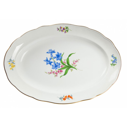 Platte, oval, Form "Neuer Ausschnitt", Blume 2 mitte, bunt, Goldrand, L 42 cm