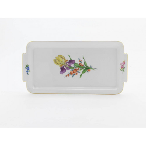 Platte,rechteck., Blume 2 mitte, bunt, Goldrand, L 29 cm