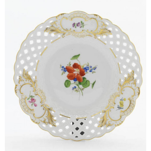 Teller, durchbr., Blume 2 mitte, bunt, Schilderornamente goldstaffiert, Goldrand, ø 19 cm