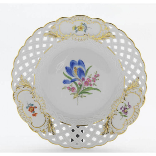 Teller, durchbr., Blume 2 mitte, bunt, Schilderornamente goldstaffiert, Goldrand, ø 21 cm