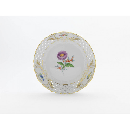Schale, durchbr. rund, Blume 2 mitte, bunt, Schilderornamente goldstaffiert, Goldrand, ø 21 cm