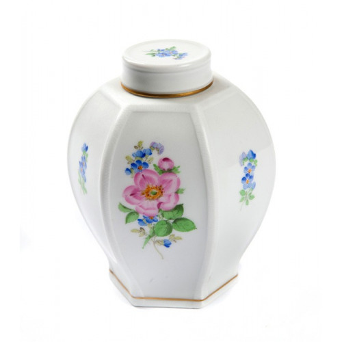 Teedose, Heckenrose und Vergissmeinnicht, bunt, Goldrand, 12,5 cm