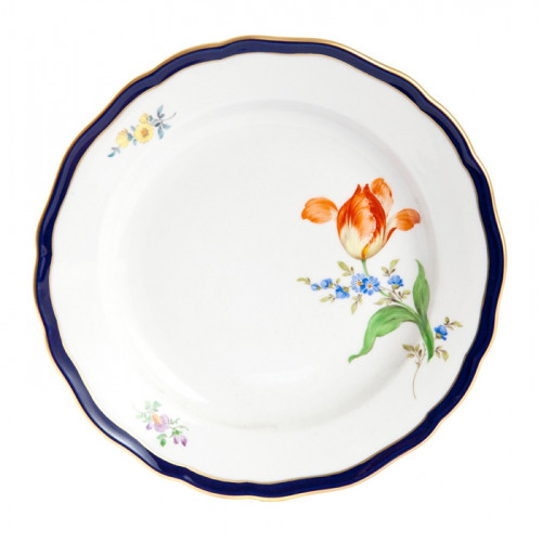 Teller, Form "Neuer Ausschnitt", Blume 2 schräg,bunt,königsblauer Reifen glas.,Goldrd.u.Goldanschlußfd., ø 20 cm