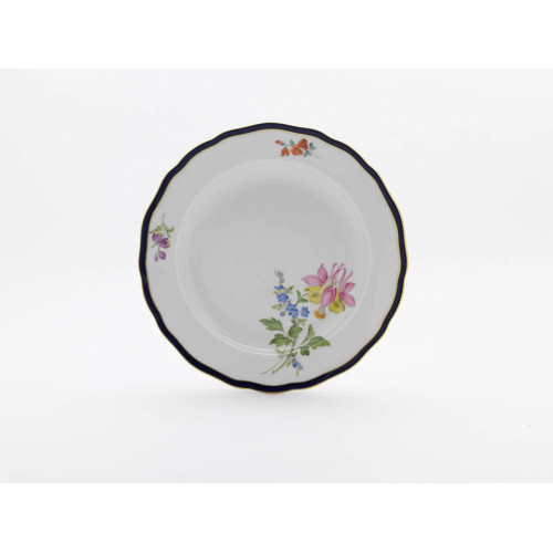 Speiseteller, Form "Neuer Ausschnitt", Blume 2 schräg,bunt,königsblauer Reifen glas.,Goldrd.u.Goldanschlußfd., L 25 cm