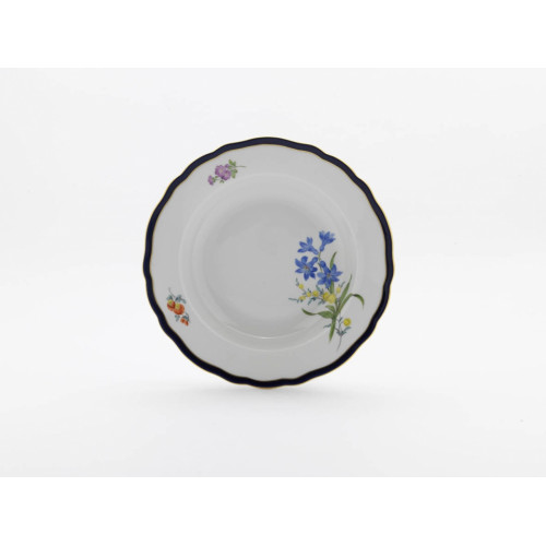 Suppenteller, Form "Neuer Ausschnitt", Blume 2 schräg,bunt,königsblauer Reifen glas.,Goldrd.u.Goldanschlußfd., ø 22 cm